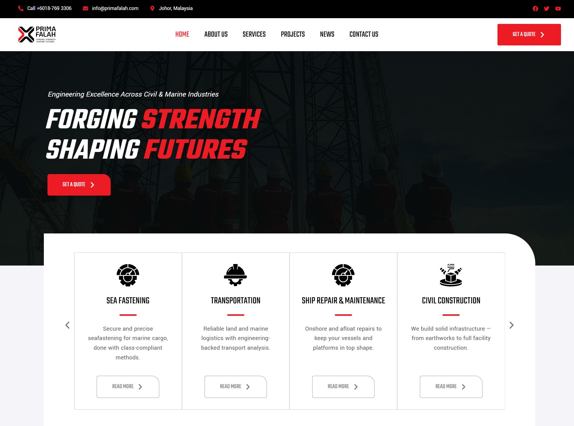 1. The website features an overview of our core services, covering Marine Engineering, Civil Construction, Engineering Design & Analysis, and Steel Works & Fabrication.