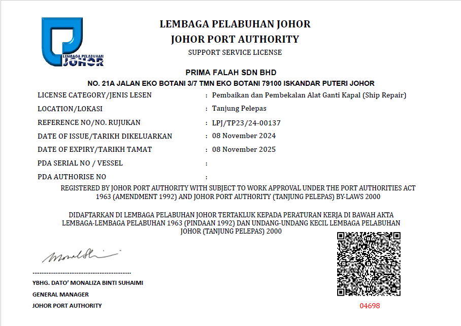 We operate nationwide, with a base in Gelang Patah, Johor Bahru, and are licensed under CIDB, Kementerian Kewangan Malaysia, and the Lembaga Pelabuhan Johor for critical port and marine services.